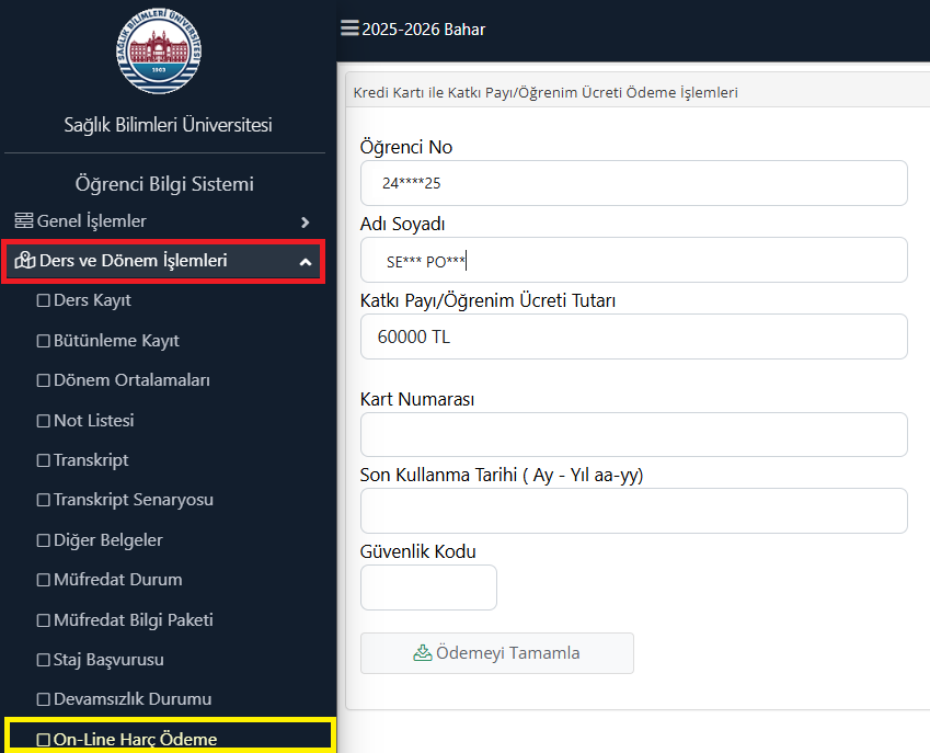 Öğrenciler akademik takvimde belirtilen ders kaydı tarihleri içerisinde Öğrenci Bilgi Sistemine kendi kullanıcıları ile giriş yaparak "Ders ve Dönem İşlemleri" menüsü altındaki "On-Line Harç Ödeme" seçeneğine tıkladıktan sonra açılan sayfada ilgili döneme ait borcunu kart bilgilerini girerek ödeyebilirler.